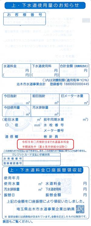 ※「上・下水道使用量のお知らせ」(検針票)の通信欄に「令和9年○月検針分まで水道基本料金 半額減免中 」と記載されます。