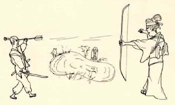 そこで家に戻って弓をたずさえ、夫の仇(かたき)とばかりに矢を放ち、仁右衛門の眼(まなこ)を射抜いたのである。仁右衛門は刺さった矢を引き抜き、串刺(くしざ)しの片目を池の中にたたきこんで館(やかた)へと戻った。